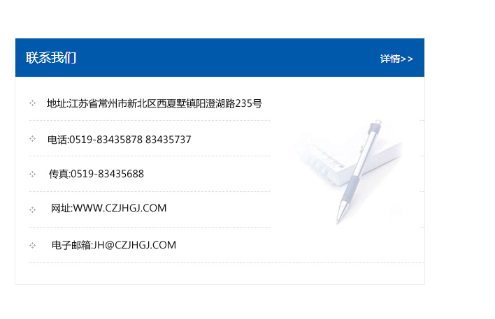 地址:常州市新北區友邦商務大廈1幢16、17層  電話:0519-85101652  傳真:0519-85112595  郵編:213022  網址:www_cz-jiayue_cn.zlddkj.com  郵箱:xiajifengaa@163.com